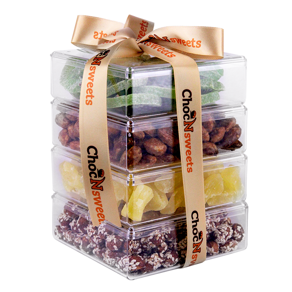 A celebration just wouldn't be complete without something sweet. Send best wishes with this enticing tower of dried fruits including dried pineapple, dried kiwis, honey roasted almonds, and sesame almonds.